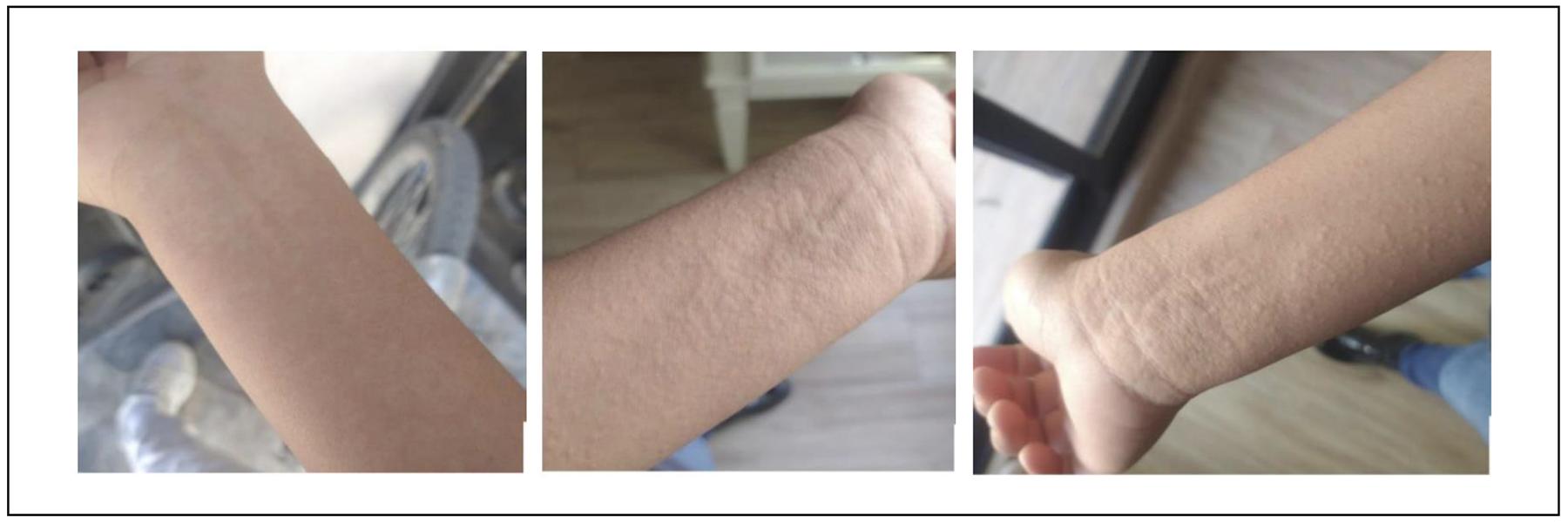 Paciente femenina de 22 años, con antecedente de urticaria colinérgica en tratamiento con inmunoterapia sin mejoría y mejoría parcial con el uso de antihistamínicos. Hace 6 meses presentó cefalea, malestar general, piel seca, habones persistentes y artralgias en falanges distales y rodillas. Se solicitaron los siguientes paraclínicos: Anti CCP, anti-DNA, B2 glicoproteínas negativo, antinucleares positivo 1:90 patrón nuclear homogéneo, anticardiolipinas IgG 34, complemento C3-C4 bajo, se diagnosticó con LES ya que cumplía con 16 puntos de los criterios EULAR, actualmente en tratamiento con cloroquina y prednisona con mejoría en los síntomas. Figura 1