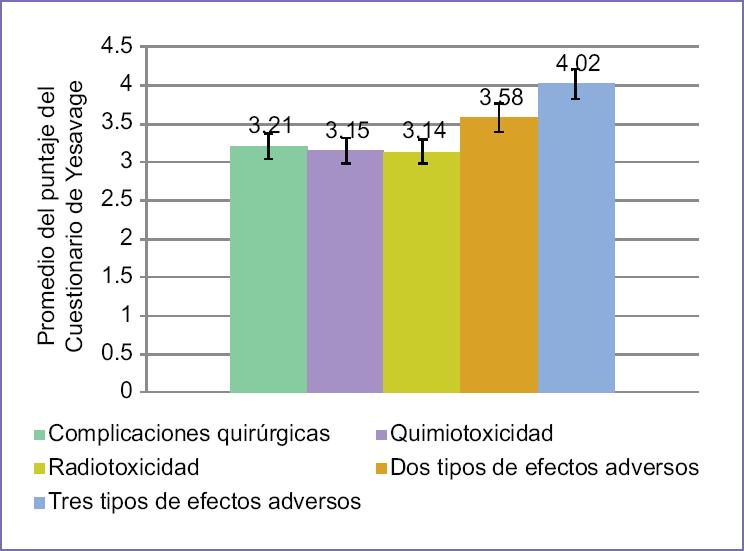 Figura 1 Promedio de puntaje del cuestionario de Yesavage según efectos adversos al tratamiento antineoplásico (n = 22). RA: reacciones adversas.