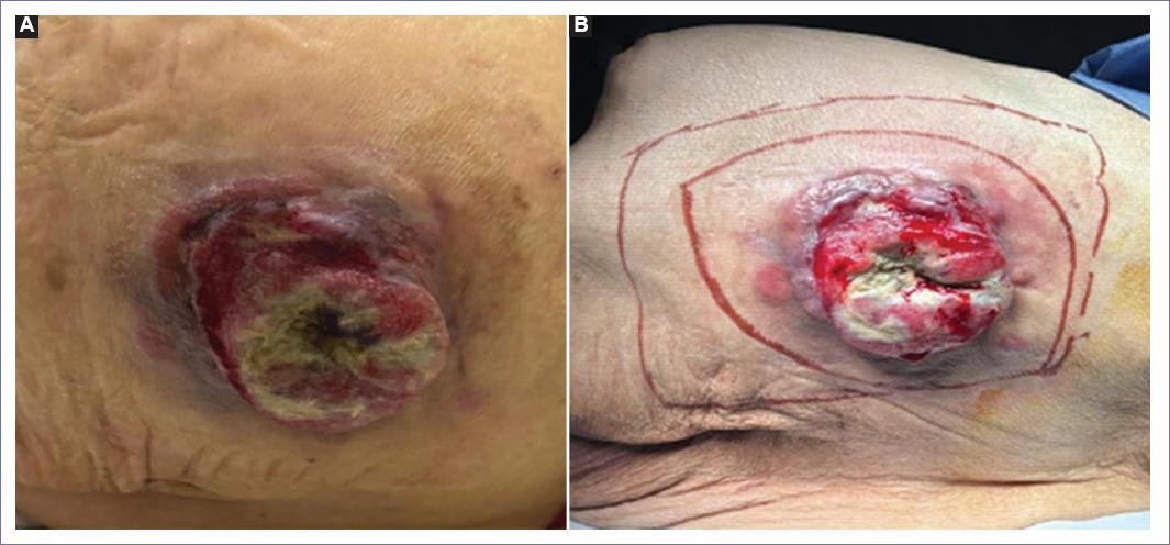Figura 1 A: tumor en glúteo izquierdo de 7 × 5 cm, ulcerado, móvil. B: tumor en glúteo izquierdo con marcaje preoperatorio.