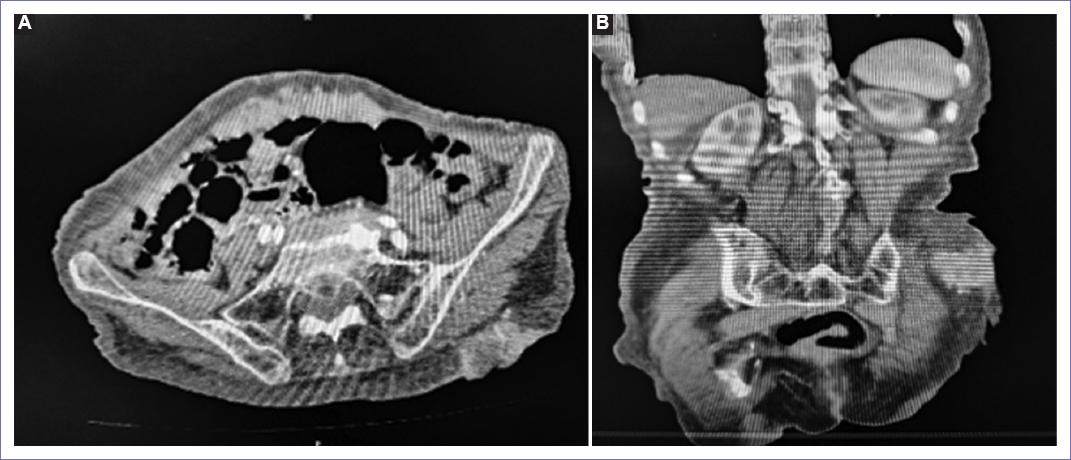 Figura 2 A: tomografía axial de abdomen en fase contrastada con presencia de tumor en glúteo izquierdo. B: imágenes coronales por tomografía abdominal contrastada donde se evidencia tumor en glúteo izquierdo hasta fascia muscular.