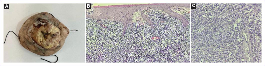 Figura 3 A: huso de piel de 12.5 × 10 × 3 cm con piel rugosa, ulcerada y ahulada que contiene lesión central nodular indurada y umbilicada que mide 8 × 7 × 2.5 cm. B y C: corte histológico donde se aprecia lesión difusa de bordes mal delimitados en dermis papilar y reticular. A mayor aumento conformado por células pequeñas, redondas y azules de aspecto epitelioide con nucleolos incospicuos con mitosis dispersas.