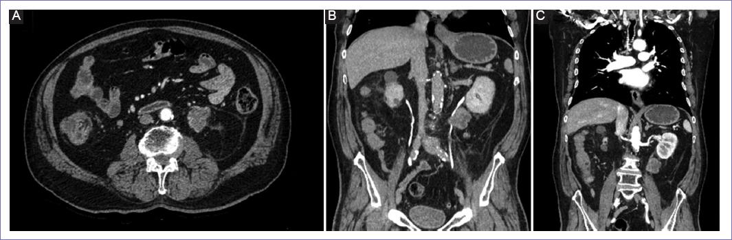 Figura 1 A: tomografía axial de abdomen en fase contrastada con presencia de tumor retroperitoneo con afectación de uréter izquierdo. B y C: imágenes coronales por tomografía abdominal contrastada donde se evidencia tumor en retroperitoneo con afectación de uréter izquierdo hacia pelvis renal izquierda.