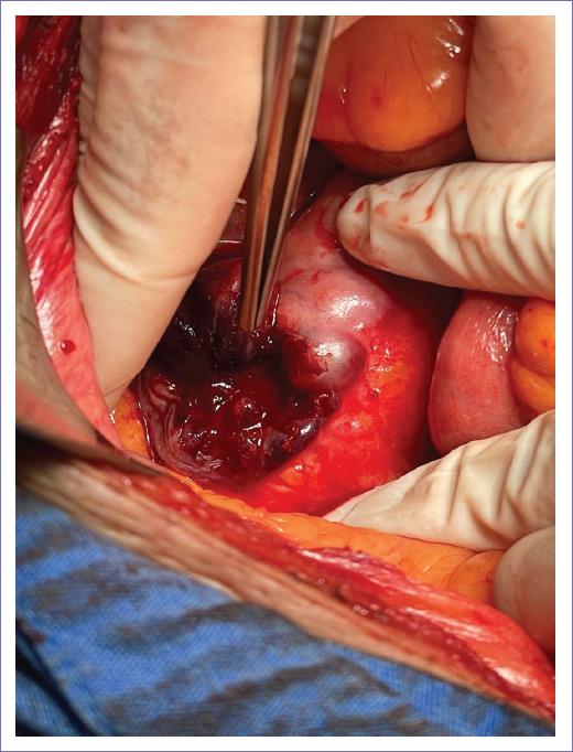 Se realizó laparotomía exploradora y se encontró tumor de 12 × 15 cm aproximadamente, irregular, pétreo, cápsula con ulceración (Fig. 2) con afectación a estructuras adyacentes como colon izquierdo, riñón izquierdo desde polo superior hasta región de psoas ilíaco, con extensión medial hacia aorta, así como tercera y cuarta porción del duodeno y vasos mesentéricos, por lo que se considera como irresecable de forma transquirúrgica, sin presentar eventualidades durante la intervención.
