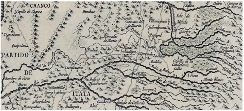 La llegada de los españoles al Valle del Itata introdujo nuevas formas de organización territorial. La fundación de San Bartolomé de Chillán en 1580 marcó un hito en la transformación del paisaje, inicialmente como una fortaleza defensiva y, más tarde, como un núcleo de desarrollo económico.7 A partir de 1612, las estancias, el sistema de encomienda8 y los jesuitas realizaron incursiones misioneras,9 estrecharon lazos con las comunidades locales,10 lo cual contribuyó a redefinir el espacio, integrando elementos indígenas en un modelo territorial basado en el control y la explotación económica. No obstante, estas intervenciones también funcionaron como espacios de interacción y adaptación mutua entre indígenas y colonos.11