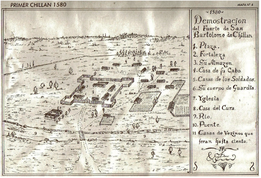 Esta ciudad-fuerte asumió un papel estratégico y militar “en el territorio comprendido entre los ríos Itata y Laja, que era el límite del hábitat de los Picunches, Pehuenches y Mapuches, y servía como frontera contra los ataques indígenas”.60 Estos enfrentamientos bélicos y la compleja organización indígena en el espacio situado entre los ríos Itata-Ñuble-Biobío61 explican la fundación de Chillán, ya que sirve como baluarte contra los indígenas de las llanuras y las montañas, a partir de un fuerte que ya se había construido en 1579.