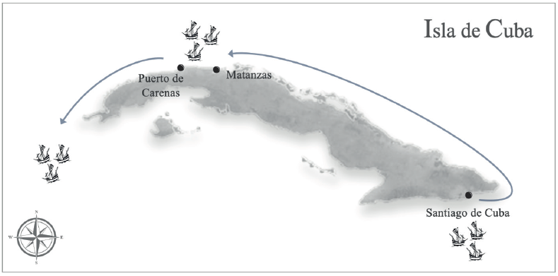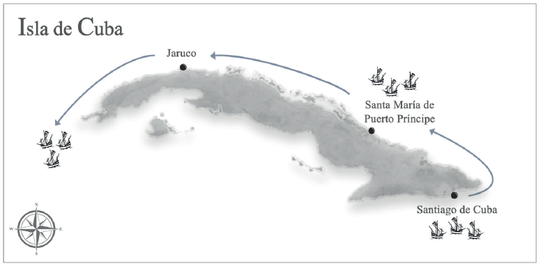 La ruta de la expedición los llevó desde Santiago de Cuba por la costa norte, realizando una escala en Santa María de Puerto Príncipe.50 Investigaciones arqueológicas e históricas han asociado este sitio con Pueblo Viejo, en la bahía de Nuevitas,51 donde el análisis dietario muestra la presencia de cerdo (Sus scrofa).52 Bartolomé de Las Casas confirma que en este lugar se abastecieron de carne, agua y leña.53 Pueblo Viejo fue el primer asentamiento de la villa de Santa María del Puerto del Príncipe, actualmente conocida como Camagüey.54