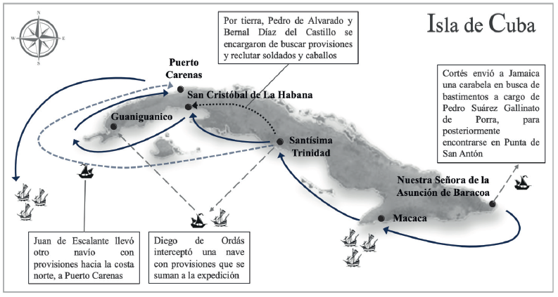 Antes de llegar a la villa de Santísima Trinidad, Cortés tuvo conocimiento de un navío procedente de Jamaica con dirección a Cuba, destinado a abastecer la zona minera. El extremeño confiscó el navío y su carga de puercos, tocino y casabe, integrándola a las provisiones de su armada.87 En Trinidad, Cortés recibió información sobre otro cargamento en dirección a las minas de Xagua, lo que supuso un incremento significativo en las provisiones disponibles; este cargamento incluía casabe, tocinos y maíz. Cortés envió a Diego de Ordás para apoderarse de la nave y dirigirla al cabo de San Antón en la punta occidental de la isla.88 Durante los doce días que permanecieron en la villa de Santísima Trinidad,89 Cortes engrosó aún más las provisiones mediante coacciones o negociación, adquiriendo más puercos, casabe, maíz, y algunos caballos, sumando entre cien y doscientos hombres que habían participado en la expedición de Juan de Grijalva.90