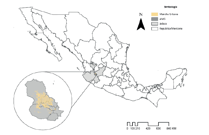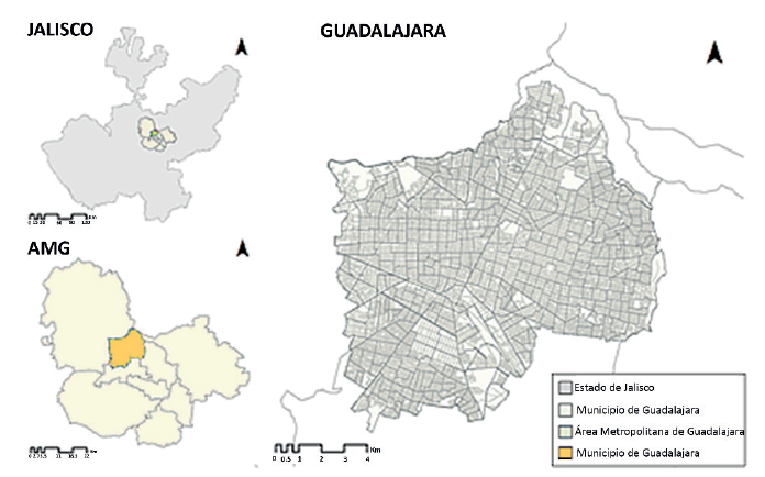 El Área Metropolitana de Guadalajara (AMG), localizada en la parte central del estado de Jalisco, está actualmente conformada por nueve municipios: San Pedro Tlaquepaque, Tonalá, Zapopan, Tlajomulco de Zúñiga, El Salto, Juanacatlán, Ixtlahuacán de los Membrillos, Zapotlanejo y Guadalajara (Figura 1).
