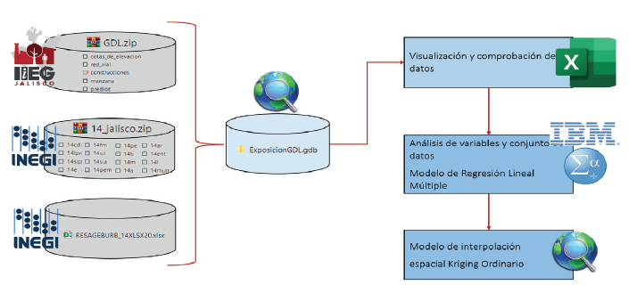 Para su obtención, se recurrió a un largo proceso de homogenización de los datos dentro de la herramienta ArcMap y Excel en paralelo. Como resultado del proceso anterior, se obtuvo el tabulado correspondiente a las características de las viviendas en la que cada una de las columnas representa cada variable mencionada al inicio del apartado y que, una vez exportada en formato .xls se procede a su análisis dentro de la herramienta IBM SPSS Statistics. La base de datos constó de la descripción detallada de 140,092 elementos referentes a las viviendas habitadas del municipio de Guadalajara, Jalisco, México.
