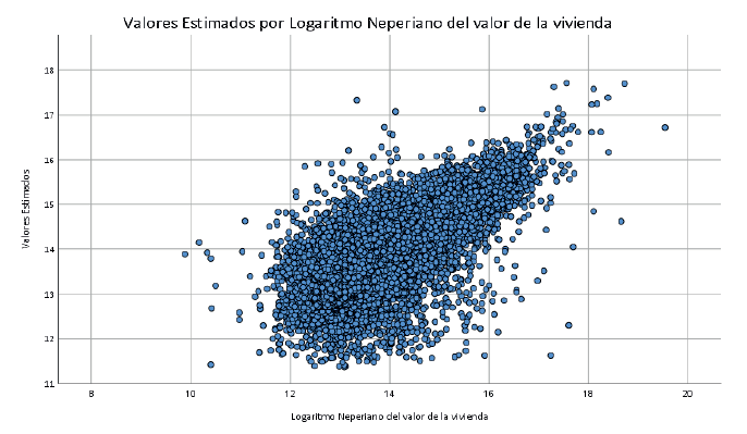 Acorde al resultado obtenido del RMSE se demuestra que el modelo cuenta con una capacidad predictiva favorable al ser su valor cercano a 0. No obstante, al analizar el gráfico de dispersión entre el valor estimado del modelo y el valor real obtenido de la variable independiente del modelo: LnValor, se observa como los valores siguen una distribución creciente positiva, afirmando que la capacidad predictiva del modelo es favorable (Bency et al., 2017) (Figura 4).