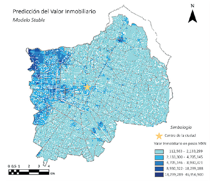 En el modelo seleccionado (Stable) la categoría más económica incluye las viviendas con valor aproximado entre $112,563 y $2’133,299 MXN; seguida de la categoría en la que los precios de las viviendas oscilan entre los $2’133,300 y $4’705,145 MXN; la tercer categoría corresponde a las viviendas en las que su valor se encuentra entre $4’705,146 y $8’930,321 MXN; seguida de las viviendas con valor inmobiliario entre $8’930,322 y $18’299,188 MXN; mientras que la última categoría agrupa al resto de viviendas que superan el valor de $18’299,188 MXN.