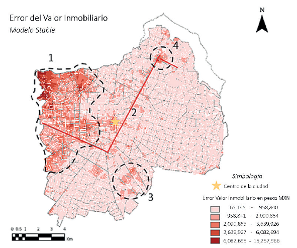 Del mapa obtenido tras la interpolación espacial de los datos por KO, y comprobando los datos con el mapa de errores correspondiente, se observa que, los inmuebles con mayor valor inmobiliario se agrupan al poniente del municipio de Guadalajara (1). Mientras que, los más baratos, que además son mayoría, se encuentran distribuidos en el resto del municipio, con mayor abundancia hacia el oriente. Figura 6.