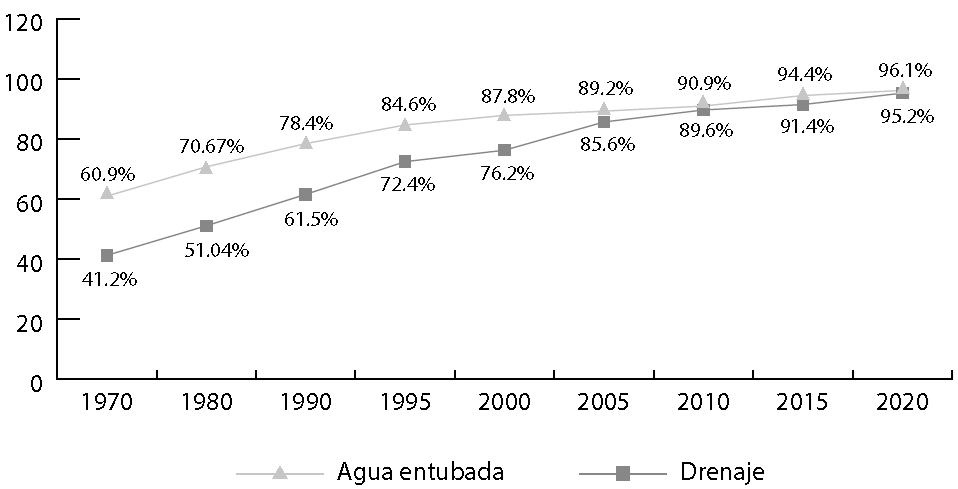 En un primer abordaje para explorar cómo ha transcurrido el cambio entre un modelo y otro, puede revisarse la cobertura de agua y drenaje con base en los censos nacionales. La Gráfica 1 muestra el grado de avance en 1970 en ambos rubros. En las décadas siguientes el esfuerzo ha continuado, y a nivel nacional se rebasa ya el 95% en cobertura. Parece una cifra avanzadas incluso a nivel global. Sin embargo, hay que matizar.