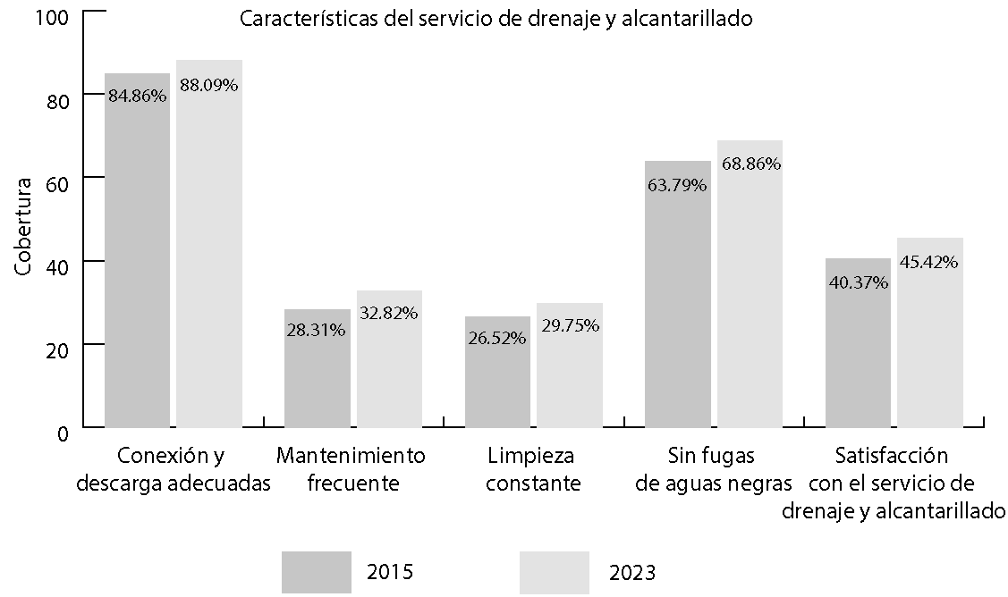 La ENCIG 2015 y 2023 del INEGI permite comparar el suministro constante y la calidad del líquido o las fugas de éste en el servicio de abasto (véase Gráfica 2). Entre 2015 y 2023, la satisfacción con este servicio se redujo un poco en todos los indicadores. La valoración final es apenas superior al 50%. Por su parte, la percepción del servicio de drenaje en cuanto a conexión, limpieza, mantenimiento y fugas mejoró un poco entre dichos años, pero se conserva bastante bajo: 45% (véase Gráfica 3).