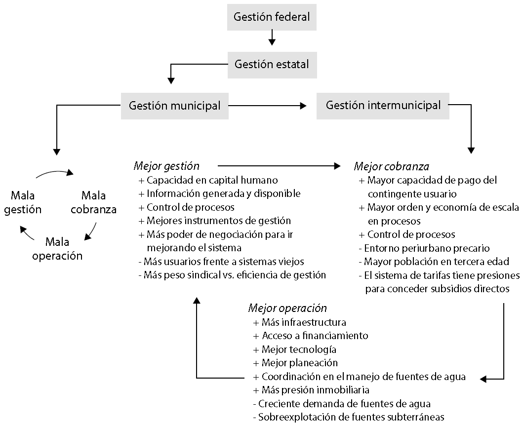 Se busca representar las conclusiones de este apartado en el Esquema 1: la dinámica del círculo vicioso de mala cobranza, mala operación y gestión en que han venido cayendo los organismos operadores de agua municipales, por un lado, y las nuevas posibilidades que se abren al crecer la escala a intermunicipal, por el otro. Con el signo + (más) se señalan las cuestiones que tienen la posibilidad de salir del círculo vicioso, y con el signo - (menos) las que aparecen como nuevos retos que, de no resolverse, empujarán al organismo operador en una nueva dinámica viciosa, pero de mayor dimensión.