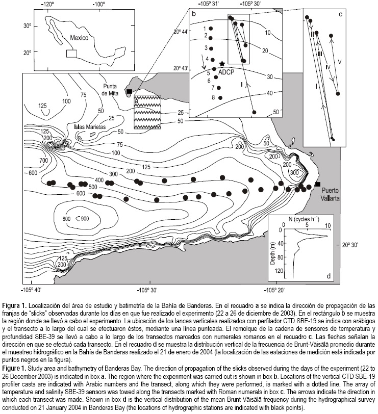 Para estudiar la estructura de las ondas internas en la zona somera de la plataforma continental de la bahía, del 22 al 26 de diciembre de 2003 se llevaron a cabo mediciones en la parte noroeste de ésta, elección basada en que es aquí donde se presenta la plataforma continental más ancha de la Bahía de Banderas, por lo que se espera que en ella se lleve a cabo una mejor desintegración de la energía de la marea baroclínica en comparación con cualquier otra zona de la bahía. Las mediciones consistieron en: (1) lances verticales con CTD ondulante SBE-19; (2) series de tiempo de componentes de velocidad de corrientes con perfilador acústico Doppler ADCP (RD Instruments, de 600 kHz); y (3) series de tiempo de temperatura para diferentes niveles de profundidad registradas mediante el remolque de cadena de sensores de temperatura y profundidad SBE-39 (Sea-Bird Electronics).