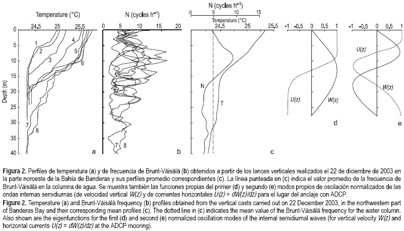 Como las mediciones fueron llevadas a cabo en la época de secas, en la que la descarga de ríos es mínima (e.g., en el caso del Río Ameca, principal afluente de la bahía, la descarga en temporada de secas es menor a 1 m3 s-1 o nula; CNA-Semarnat 1999), las variaciones de salinidad en la capa desde la superficie hasta el fondo presentaron una diferencia no mayor que 0.02, con un promedio de 34.35, por eso la variación de la densidad como función de la profundidad se encuentra prácticamente determinada por la temperatura. La frecuencia de Brunt-Váisálá, calculada a partir de los lances con SBE-19, disminuye desde 14 ciclos h-1 en la capa de 10 m hasta 4 ciclos h-1 en el fondo (fig. 2b). El perfil medio de la frecuencia de Brunt-Váisálá presenta un valor máximo de 9 ciclos h-1 en la capa de 10 m y decrece linealmente hasta un rango de 4 a 5 ciclos h-1 en el fondo (fig. 2c).