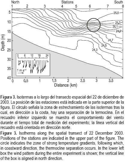 En el transecto (fig. 3) las isotermas están inclinadas y, cerca de la costa, es notable el estrechamiento entre ellas. En algunos lugares unas cuantas isotermas (e.g. la de 24.3°C) se separan y aíslan visiblemente de las otras; esto evidencia la presencia de mezcla y formación de masas de agua de densidad homogénea. Procesos de corte y mezcla de la columna de agua por ondas internas han sido descritos y cuantificados en términos de energía y de mezcla en la zona costera de Oregon (Hayes y Halpern 1976) y en el Mar de Japón (Navrotsky et al. 2004).