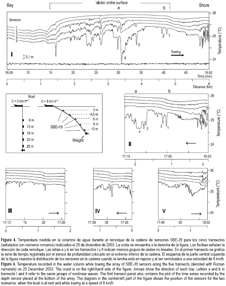 Para analizar los desplazamientos verticales de las isotermas debidos a la propagación de las ondas internas, cinco transectos perpendiculares a la costa fueron realizados con una cadena de sensores de temperatura y profundidad SBE-39 (fig. 4). La duración máxima de un transecto efectuado con la cadena de sensores fue de 44 min (transecto I); la duración de cada uno de los transectos restantes fue menor.