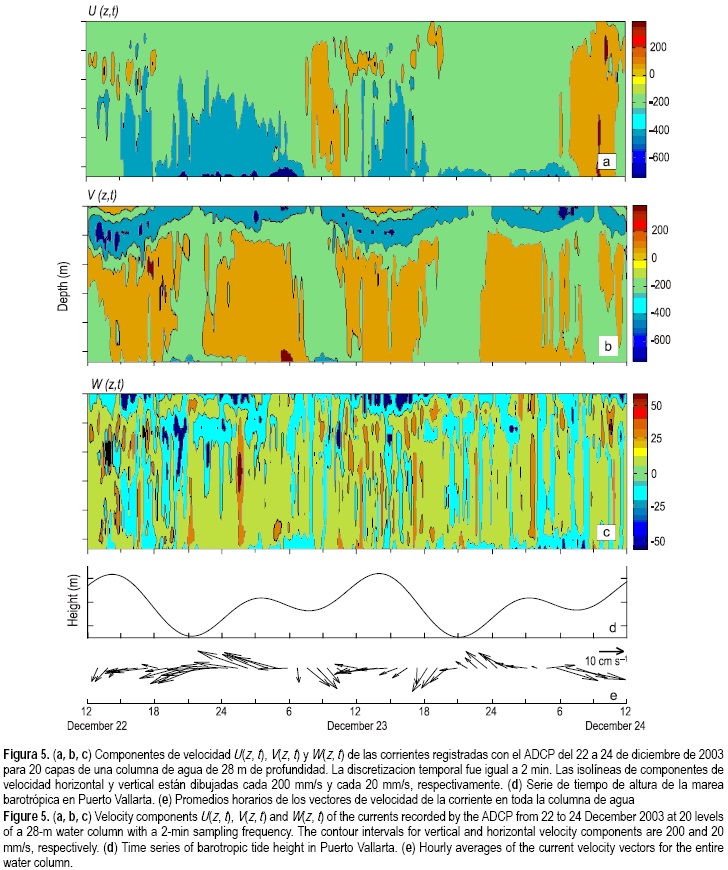 Las mediciones realizadas con ADCP indican que las componentes de velocidad en la horizontal, con valores promedio de 20 cm s-1 y máximo de 70 cm s-1, son un orden de magnitud mayor que en la vertical. Dado que el experimento se llevó a cabo durante marea barotrópica mixta con dominancia de la componente diurna (fig. 5d), el comportamiento de la circulación en el lugar del anclaje (fig. 5a-c) es muy complicado como consecuencia de la presencia simultánea de las corrientes barotrópicas y baroclínicas de ambas componentes principales de marea.