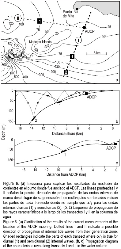 Como se observa en la figura 6, en el transecto I existen zonas de generación de marea interna diurna y semidiurna (indicados con números 1 y 2). El rayo característico de la marea diurna tiene menos de medio ciclo durante su propagación desde su origen hacia el punto de anclaje del ADCP y, por consiguiente, podemos encontrar evidencia en nuestras mediciones de la presencia de ondas internas inclinadas en las capas superficiales. En el caso de la marea semidiurna, el rayo presenta cuatro ciclos de reflexión entre superficie y fondo y, como consecuencia, en el lugar del anclaje puede formarse la estructura modal para esas ondas internas. En el transecto II la pendiente del fondo es muy suave (menos de un grado), por lo que en él se presenta únicamente una zona de generación de ondas diurnas y el rayo característico tiene poco más de un ciclo durante su propagación entre su origen y el lugar del anclaje. Por lo tanto, las ondas internas que se propagan sobre la plataforma continental, provenientes de mar abierto (no del interior de la bahía), son también ondas inclinadas, pero no pueden dar lugar a una estructura modal.