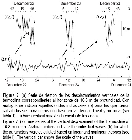 Las oscilaciones analizadas en la figura 7 están asociadas a una forma de termoclina inclinada hacia el fondo con valles pronunciados y crestas suaves. En otras palabras, estas oscilaciones fueron asimétricas y presentaron la forma parecida a la de solitones de Korteweg-de Vries (KdV) (Filonov y Trasvina 2000). Con el fin de dar base sólida a esta afirmación, se eligió la serie de desplazamientos verticales en el horizonte de 10.3 m para analizar las oscilaciones particularmente "regulares" en cuanto a su asimetría y se calcularon los parámetros característicos de las ondas internas utilizando las teorías lineal y no lineal (apéndice A).