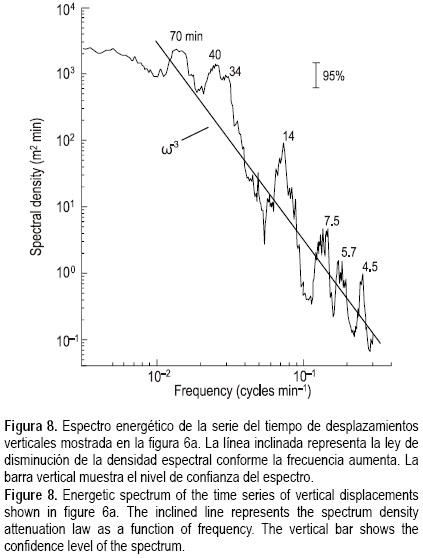 En la figura 8 se muestra el espectro de energía de la serie de tiempo presentada en la figura 7a. El espectro fue obtenido por suavizado de las 15 frecuencias independientes del periodograma correspondiente, y en él se observan varios picos de densidad espectral con periodos de 4.5 a 70 min. Su inclinación igual a ω-3, a medida que aumenta la frecuencia y disminuye la energía, es la típica para las ondas internas no lineales que se desintegran en la plataforma continental del océano mundial (Mihaly et al. 1998, van Haren et al. 2002, van Haren 2004). Este comportamiento se debe a que las ondas internas, durante su propagación sobre la plataforma continental, redistribuyen su energía de las ondas grandes a las pequeñas, en una cascada de energía similar a la que se presenta en vórtices. Un modelo analítico para el espectro de las ondas no lineales y una explicación detallada de la ley de la inclinación de ω-3 se encuentran en el trabajo de Filonov y Novotryasov (2005).