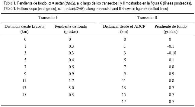 El valor medio en la vertical de la frecuencia de Brünt-Váisála (5.1 ciclos h-1) se calculó a partir de las mediciones realizadas con CTD el día 22 de diciembre de 2003. La inclinación media de los rayos característicos para esta época del año fue, en el caso de las componentes de marea diurna y semidiurna, de 0.94 y 3.8 grados, respectivamente. Los valores de la pendiente de fondo a lo largo de los transectos I y II se presentan en la tabla 1. Con base en los valores de inclinación de rayos característicos y de fondo se determinó en qué parte de los transectos se tiene un valor de α/γ (rectángulos sombreados de la fig. 6).