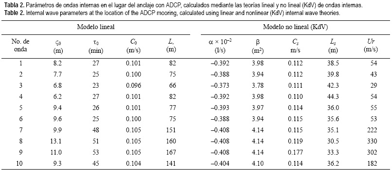 Para el cálculo mediante las fórmulas A1 a A5 (Apéndice A) de los parámetros de las ondas internas senaladas en la figura 6a se utilizaron los datos del perfil vertical de N(z) y de las funciones propias del primer modo de W(z). A partir de los resultados obtenidos (tabla 2), es posible afirmar que en la plataforma continental de la parte noroeste de la Bahía de Banderas se observan oscilaciones de corto periodo en la termoclina. Estas oscilaciones son producto de la desintegración de la marea interna y presentan una estructura muy parecida a la de solitones descritos por la ecuación de KdV. La altura y el periodo de las ondas fueron calculados a partir de los desplazamientos verticales y de la ecuación A4, respectivamente. La altura media de estas ondas tiene un rango de 6 a 13 m, con una duración de 25 a 50 min, una velocidad de fase de 0.1 m s-1 y un semiancho de entre 60 y 150 m. Su amplitud máxima fue mayor a 13 m.