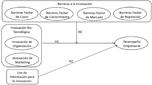 Dado que la evidencia empírica muestra que los impactos de las diferentes barreras a la innovación producen efectos diferentes en la gestión empresarial (Madrid-Guijarro, Garcia & Van Auken, 2009), se plantea el siguiente modelo teórico en la figura 1 que permitirá atender cada una de las hipótesis presentadas y las principales cuestiones de este estudio son de tres tipos. ¿Las innovaciones no-tecnológicas tienen efectos en el desempeño empresarial diferentes en empresas emergentes y en empresas consolidadas? ¿Los obstáculos para hacer innovaciones no tecnológicas tienen un efecto importante en el desempeño empresarial de las empresas según el número de años que llevan en el mercado? Si es así, ¿los efectos son diferentes para innovación organizacional e innovación en marketing?
