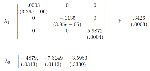 Para poder identificar estos parámetros se considera el caso más simple en el cual λ1 es una matriz diagonal y el error del modelo, ε t , tiene una matriz de covarianza diagonal constante, σ 2 I .11 Así, los parámetros estimados junto con sus errores estándar en paréntesis son: