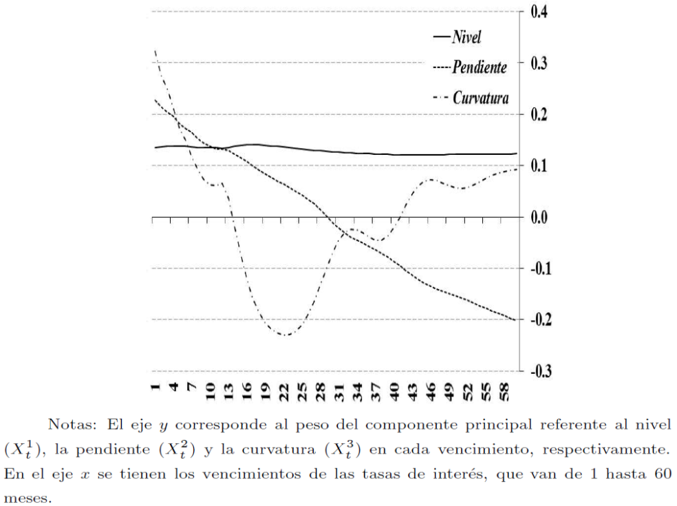 , en su representación de nivel, pendiente y la curvatura de la estructura temporal de las tasas de interés. Además, se grafican sus valores empíricos, por ejemplo, el vencimiento máximo de la tasa de interés es equivalente al nivel de la estructura temporal (nivel =