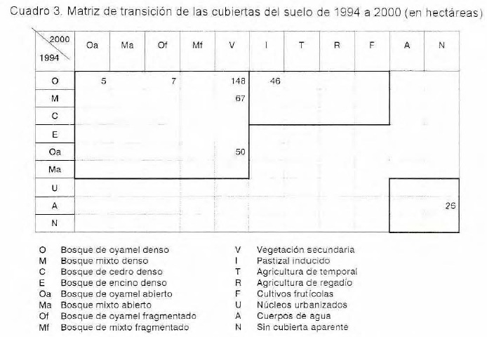 En función de la superficie total por tipo de cubierta, en cada una de las fechas consideradas, llama la atención la pérdida en las dos principales formaciones vegetales de la zona. Los bosques densos de oyamel perdieron más de 800 ha entre 1971 y 1994 y otras 200 ha en los últimos seis años. Esto significó una pérdida de 4.6 % de su cubierta en el primer período mencionado y de 1.2% de 1994 al 2000. Por su parte, los bosques mixtos densos, más extendidos, a partir de 1971 han perdido 4.5% de su superficie (1 436 ha). Los bosques densos de cedro y encino a pesar de su recuperación, permanecieron siendo muy poco significativos respecto al área considerada (Cuadro 1).