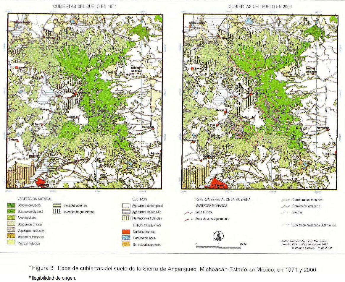 Resulta también de gran interés el incremento de superficie de bosques abiertos y fragmentados, especialmente los de oyamel, así como de la vegetación arbustiva. Estas tres categorías se consideran como una perturbación del bosque y no como una pérdida, ya que, al no haber un cambio total del uso (de forestal a agropecuario) y al permanecer especies propias de bosques, existe la posibilidad de su recuperación a mediano plazo. Estas clases perturbadas incrementaron sus superficies hasta alcanzar un total de 10 200 ha en el 2000, respecto a las 10 000 de 1994 y las 7 700 de 1971. Es decir, los espacios forestales perturbados pasaron de cubrir 5,7% de la zona en estudio a ocupar el 7.6% (Cuadro 1).