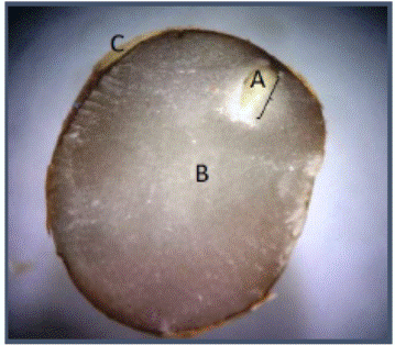 La testa envuelve un endospermo compacto, vidrioso, donde se encuentra un embrión rudimentario de ≤ 0,35 cm de largo, de forma cilíndrica, amarillo claro, consistencia suave, posición basal cerca del micrópilo, el epicótilo y la radícula no presentan muchas diferencias, excepto que la radícula en la parte inferior tiende a ser más ancha (fig. 2).