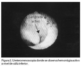 Paciente del sexo femenino de 27 años de edad, sin antecedentes de importancia quien tres meses antes de presentarse en nuestro servicio inicia, sin causa aparente, con hematuria total, intermitente, con coágulos amorfos y filiformes, silente, en tres episodios autolimitados. A la exploración física se encontró con signos vitales normales. Tenía palidez de mucosas y tegumentos. La exploración cardiopulmonar fue normal. El abdomen se encontró sin alteraciones, sin dolor ni masas anormales y no se auscultaron soplos en las fosas renales. Sus estudios de laboratorio mostraron anemia de 7g/dL de hemoglobina y hematocrito de 22%. El resto de sus exámenes hematológicos y bioquímicos fueron normales. El examen general de orina mostraba eritrocitos eumórficos incontables y 4 leucocitos por campo de gran aumento. El urocultivo se reportó sin desarrollo. Se realizaron citologías urinarias y BAAR en orina con resultados negativos. Se realizó urografía excretora que mostró placa simple normal, fase pielográfica ausente del lado izquierdo con fase nefrográfica persistente del mismo lado a los 180 minutos. El lado derecho se observó de características normales. El ultrasonido renal bilateral no mostró alteraciones. Al aplicar Doppler se observaron vasos intrarrenales conflujo de alta velocidad y turbulencia además de flujo pulsátil de la vena renal izquierda (Figura 1). El ultrasonido doppler derecho no mostró alteraciones. Se realizó ureterorrenoscopia encontrando el uréter normal y salida de sangre a través del cáliz inferior y posterior (Figura 2). Se realizó arteriografia renal izquierda observando imagen compatible con fístula arteriovenosa izquierda en el polo inferior (Figura 3). Se procedió entonces a realizar embolización selectiva con etanol absoluto. Hubo remisión total inmediata de la hematuria. La paciente continúa asintomática y con exámenes de laboratorio normales a un año de su intervención.