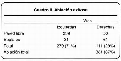 El éxito inmediato de la ABL obtuvo la interrupción de 381 vías accesorias (87%) 218 eran vías de conducción manifiesta (57%), 147 vías ocultas (39%) y 16 vías de conducción intermitente (4%). Por su ubicación 270 vías se encontraban del lado izquierdo (71%); 239 localizada en la pared libre (239/270 (80%)) y 31 en la región septal (31/270(12%)). Las 111 vías accesorias de el lado derecho (29%); 50 situadas en la pared libre (50/111 (45%)) y 61 de localización septal (61/111 (55%)) (Cuadro II).