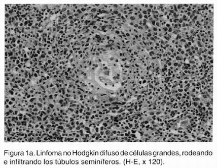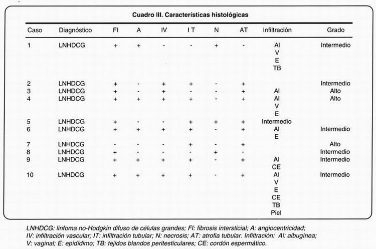 Las características histológicas se resumen en el cuadro III. En el 100% de los casos se contó con el estudio histopatológico de las lesiones. Utilizando la clasificación de la REAL todos los casos fueron diagnosticados como linfomas no Hodgkin difusos de células grandes (LNHDCG). Utilizando la clasificación de la Working Formulation como equivalente, siete linfomas fueron de grado intermedio y tres linfomas de alto grado. En dos casos se reportó un componente mixto de células grandes y pequeñas hendidas. En todos los casos se observó infiltración difusa por células linfoides neoplásicas; con atrofia tubular y fibrosis intersticial en ocho y nueve de los casos, respectivamente (Figura 1). En siete casos se identificó invasión y destrucción de la pared de los túbulos seminíferos. En seis de los casos se observaron células neoplásicas dispuestas de manera concéntrica a las paredes vasculares con angioinvasión. En cuatro casos se observó de manera simultánea angiocentricidad, angioinvasión e invasión tubular. Focos de necrosis se observaron en tres casos. En seis pacientes se documentó la invasión a estructuras adyacentes, todos los casos mostraron invasión a la túnica albugínea, cuatro al epidídimo, tres a la túnica vaginal y dos al cordón espermático y tejidos blandos. Sólo en un caso se documentó invasión a la piel del escroto.