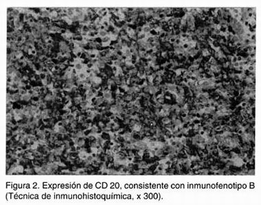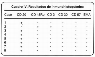 En ocho casos se contó con bloques de parafina para realizar estudio de inmunohistoquímica. Siete casos (87.5%) mostraron inmunofenotipo B, fueron positivos para CD20 y negativos para CD3 y CD45Ro (Figura 2). Uno de los casos (12.5%) presentó inmunofenotipo T, siendo positivo para CD3 y CD45Ro y negativo para CD20 (Cuadro IV).