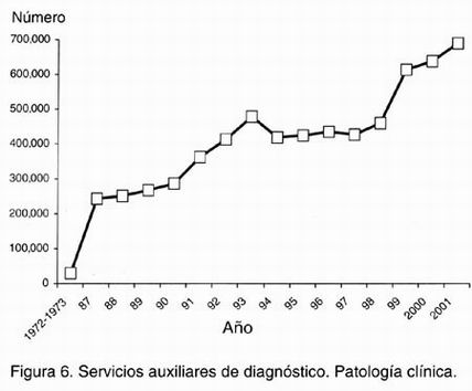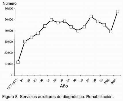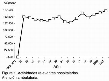 Los pacientes que acuden por primera vez al hospital provienen 75% del Distrito Federal, 12% del Estado de México, 4% de Guerrero, 2% de Morelos y el 8% del resto de los estados. Del Distrito Federal asiste 29% de Tlalpan, 15% de Coyoácan, 15% de Iztapalapa, 13% de Xochimilco, 5% de Tlahuac y 23% del resto de las delegaciones. De los pacientes que acuden al hospital, 84% gana de 0 a 3 salarios mínimos, 68% son referidos; 47% del primer nivel, 1% del segundo nivel, 3% del tercer nivel y 17% de diferentes instituciones (Delegaciones, DIF, IMSS, ISSSTE etcétera), y el 32% acude sin referencia, además se contrarrefiere a pacientes a las diferentes jurisdicciones sanitarias. A partir de 1987 el hospital lleva información estadística sistematizada y confiable sobre la atención ambulatoria, como se puede ver en la figura 1 ésta es de más de 150 mil pacientes anuales y mantiene una ligera tendencia de aumento, mientras que en el cuadro I se presentan algunos de los principales indicadores de eficiencia y de calidad, como resultado cualitativo de las acciones médicas. En las figuras 2 a 7 (2, 3, 4, 5, 6, 7)se presenta la productividad de algunas actividades relevantes hospitalarias como son los egresos hospitalarios, las cirugías mayores, los eventos obstétricos, las urgencias, las patologías clínicas, las radiológicas y las imágenes de tomografía computada. La División de Terapia Física y Rehabilitación atiende más de 26,500 pacientes al año proporcionando sesiones en sus diversos modalidades: hidroterapia, electroterapia, mecanoterapia y terapia ocupacional y realiza los estudios de electromiografías (Figura 8). En todas las figuras los valores de 1972 se refieren al último trimestre, sumado a todo el año de 1973. Foniatría atiende 10,000 personas anuales otorgando diversas sesiones tales como de lenguaje, aprendizaje y auditivas.
