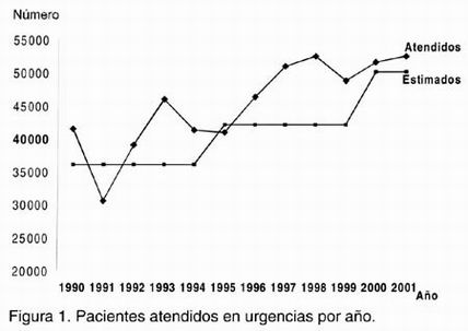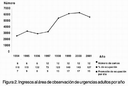 En la figura 1 se muestra el número total de pacientes atendidos anualmente de 1993 a 2001. Como se puede observar existe un incremento constante de pacientes que son atendidos, lo que repercute en un aumento aproximado del 10% sobre la meta programada. En el área de observación de adultos se recibieron 6279 pacientes en el 2000, de los cuales 54% fue de mujeres, destaca que, debido a sobresaturación, 68% de los pacientes fue enviado a su domicilio, después de haber sido atendido, con indicaciones precisas para continuar su manejo en la consulta externa o en centros de salud. Aunque en 2001 se recibieron 5580 pacientes, aproximadamente 12% menos que en el 2000, la tasa de ocupación continuó elevada en 27%. Estos pacientes son atendidos en las 12 camas del área de urgencias médico quirúrgicas, las cuales son a todas luces insuficientes (Figura 2).