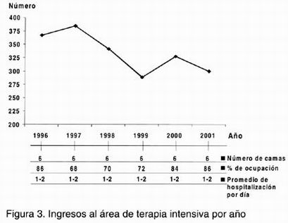 La figura 3 muestra el ingreso de pacientes a la UCI representando un porcentaje de ocupación en los dos últimos años por arriba de 85%, con promedio de hospitalización por día de uno a dos pacientes, contando actualmente con seis camas.