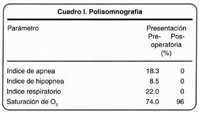 Se usó la prueba de Fischer para comparar las alteraciones de la deglución comparándolas con un grupo de pacientes con SPR no tratados, encontrando una diferencia estadísticamente significativa del pH. Los resultados de la polisomnografía asociada a pHmetría fueron validados con la prueba de McNemar por tratarse de observaciones antes y después del tratamiento. Antes del tratamiento el grupo de pacientes estudiados presentaba en promedio un índice de apnea de 18.3, índice de hipopnea de 8.5 e índice respiratorio de 22. La saturación de 0 2 promedio en ocho horas, fue de 74%. Después de la distracción desaparecieron los episodios de apnea e hipopnea en todos los pacientes y la saturación de 0 2 promedio subió a 96% (Cuadro I).