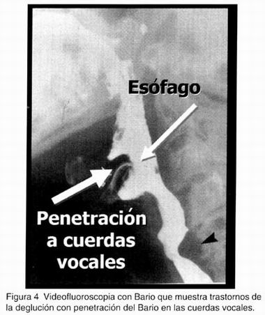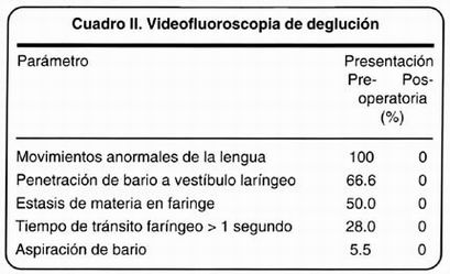 Los resultados obtenidos mostraron que el aumento en la dimensión del cuerpo mandibular obtenido por la distracción varió de nueve a 17 milímetros (promedio 13, Figura 3). Con la polisomnografía se determinaron los índices de apnea e hipopnea así como el índice respiratorio. Se diagnosticó apnea del sueño cuando se detectaron cinco o más episodios de apnea con duración mayor de 10 segundos en una hora. En la medición del pH esofágico se consideró un episodio de reflujo cuando se registró un pH de cuatro o menos con duración mínima de 15 segundos. Con la videofluorscopia con Bario se identificaron las alteraciones de la deglución, considerando como anormales el retraso en el tránsito en la fase faríngea (paso del bolo de la base de la lengua al esófago) de más de un segundo (Figura 4), cuando el Bario pasa del vestíbulo faríngeo hasta las cuerdas vocales y cuando hay aspiración a vías respiratorias y el Bario está por debajo de las cuerdas vocales. 16