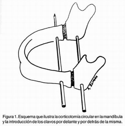La intervención se llevó a cabo bajo anestesia general con intubación endotraqueal. Se practicaron incisiones en vestíbulo bucal en ambos lados, por disección subperióstica se expuso el cuerpo mandibular en la región del gonio. Se llevó a cabo una corticotomía circular por detrás del reborde alveolar inferior asegurándose que la capa cortical estuviera totalmente cortada en ambos lados. Se introdujeron en ese momento dos clavos de acero inoxidable, uno por delante y otro detrás de las corticotomías. Debido a la fragilidad de la mandíbula a edad temprana se utilizaron dos clavos largos que atraviesan de un lado al otro de la mandíbula (Figura 1). Se fijaron los clavos de cada lado a un dispositivo de tracción y se tomaron medidas de la distancia entre los dos clavos. Se suturó la mucosa bucal con material absorbible. Al tercer día posoperatorio se inició la distracción a razón de 1 milímetro por día continuando el proceso hasta lograr la proyección del reborde alveolar de la mandíbula por delante del reborde maxilar. Se interrumpió en ese momento la distracción dejando los clavos y el dispositivo en su sitio durante seis a ocho semanas esperando la consolidación del hueso neoformado (Figura 2). Los estudios de polisomnografía, pH esofágico y videofluoroscopia de la deglución se repitieron dos semanas después de haber terminado el período de consolidación y de retirar los clavos.