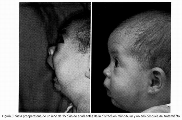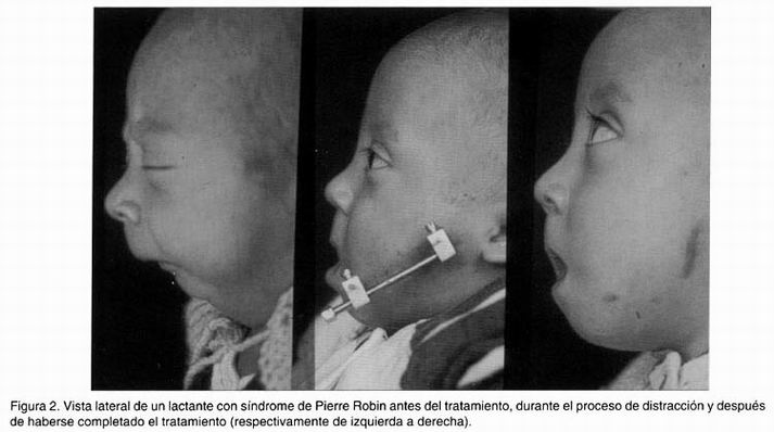 Tradicionalmente se ha tratado el síndrome de Pierre Robin (SPR) mediante la fijación de la lengua al labio superior para prevenir su desplazamiento posterior asociado a la alimentación con sonda nasogástrica en el periodo inicial. Esta fijación se mantiene durante un año o más hasta el momento del cierre quirúrgico de la fisura palatina, mientras se espera a que la mandíbula siga su crecimiento. 6 Existen numerosas citas en la literatura en las que se asevera que la mandíbula adquiere finalmente dimensiones normales. Este concepto no ha sido fundamentado con estudios bien documentados. Las mediciones del tamaño mandibular a largo plazo en pacientes con Pierre Robin llevados a cabo por Figueroa 7 demuestran que aunque la mandíbula crece, no alcanza sus dimensiones normales, lo cual coincide con las observaciones en nuestros pacientes con este síndrome. Se acepta que glosoptosis es el resultado de la dimensión reducida de la mandíbula lo cual produce episodios de apnea por obstrucción con la lengua. La prevalencia de RGE en estos niños ha sido reportada por Dudkiewicz y colaboradores 8 pero no hay en la literatura estudios de la deglución relacionados con la dificultad para la alimentación y son escasos los reportes sobre la distracción mandibular temprana en estos pacientes. 9