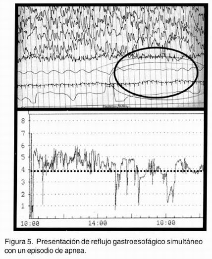 En la videofluoroscopia con Bario se encontraron alteraciones graves de la deglución en todos los pacientes variando desde penetración de Bario a vestíbulo faríngeo hasta aspiración del mismo a vías respiratorias. Después del tratamiento la deglución se normalizó en todos los pacientes (Cuadro II). En la medición preoperatoria del pH esofágico se encontró RGE en 15 pacientes, lo que representa 83% del grupo estudiado. En las mediciones postoperatorias no se documentó ningún evento de reflujo aunque se detectaron eventos aislados de pH menor de 4 los cuales fueron menores de 15 segundos, lo que indica una disminución significativa del RGE con la distracción mandibular. Analizando en conjunto los eventos de RGE simultáneamente con polisomnografia se observó que se presentaron siempre dentro de los dos minutos siguientes a los episodios de apnea (Figura 5). Los episodios de apnea con duración menor de 15 segundos sin disminución a la saturación de 0 2 no se asociaron a RGE.