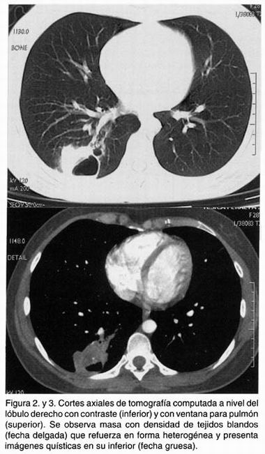 En la radiografía digital del tórax se observa una imagen radiopaca, ovalada, de bordes regulares en la base del pulmón derecho adyacente al perfil derecho del corazón y por debajo del hílio pulmonar ipsolateral (Figura 1). En los cortes axiales de tomografía computada helicoidal en fase simple, se observa una imagen con atenuación de tejidos blandos, amorfa, heterogénea, de bordes irregulares, la misma que posterior a la inyección del contraste intravenoso presentó reforzamiento heterogéneo, con incremento en el calibre de los vasos que rodean la lesión (Figuras 2 y 3).