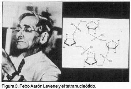La primera mitad del siglo XX, vena grandes avances en la bioquímica de la nucleína, sobresaliendo en ello, Febo Aarón Levene (Figura 3), quien estudiara con Pavlov y con el músico-quimico Borodín en Rusia, y luego con el ya citado Kossel, antes de emigrar a América. Él, y más tarde Todd, desmenuzan químicamente al DNA: enlaces, distancias interatómicas, ángulos planares, cargas, etcétera. Irónicamente, la molécula de DNA más lograda por estos químicos, resultó ser un tetranucleótido: cerrado, inmutable ......perfecto (Figura 3). Pero demasiado pequeño como para tener que ver algo con la herencia, que -se creería cada vez más- sólo podría recaer en moléculas mucho más grandes, como las proteínas. El pobre Febo cargará por ello con la culpa histórica de haber propuesto una molécula tan incuestionable (el tetranucleótido), que así se convierte en barrera, que no camino, en la búsqueda de la estereoquímica macromolecular del DNA. Los genes (o como se les llamara entonces: gémulas, idioplasmas, parigenes, bióforos, etc. segaran siendo una entelequia. En esta fase histórica del DNA, la última aportación de la Bioquímica (regresará eso si, casada con la Genética, ya como Biología Molecular) será la notable observación de Erwin Chargaff (Figura 4) de que en las células las concentraciones molares de adenina siempre son iguales a las de timina, y las de citosina iguales a las de guanina. Ésta, la llamada Regla de Chargaff fue la primera insinuación -que no certeza- de complementariedad, y le resultará crucial a Watson y Crick al proponer la función codificadora del DNA. En los años cuarenta Caspersson revive el estudio del DNA al señalar que no se trataba de una molécula pequeña, sino de un polimero enorme y birrefringente. Más grande -pero aparentemente también menos complejo- que las proteínas. Ahora sabemos porqué: DNA = cuatro bases, fosfato y deoxirribosa, en tanto que proteínas: mezcla de 20 posibles aminoácidos y algunos agregados (azúcar, lípidos).