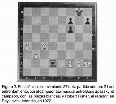 La más célebre partida quizás es la número 21 de este enfrentamiento, la cual ha sido magistralmente analizada por el connotado campeón nacional Arturo Xicotencatl Rentería, quién nos acompaña en esta sesión. En el movimiento 27 (Figura 2), Fisher elude la captura de un peón, el de f2, que lo hubiera llevado posiblemente a la derrota. Unos pocos lances después la imprecisión de Spassky le permite la creación de un peón libre que lo lleva gloriosamente a la victoria. "El peón libre es un criminal" afimaría el letonés Nimzovitch.